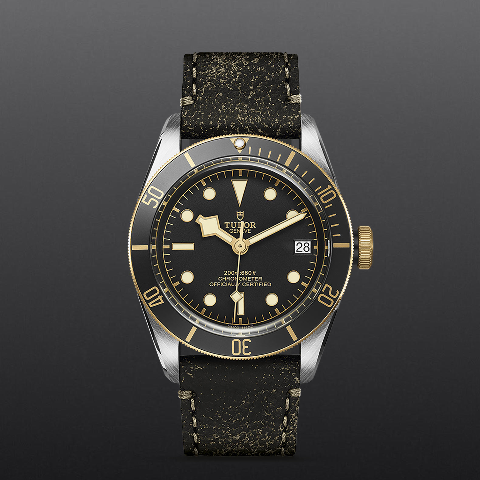 Enhancing the Black Bay with yellow gold capping creates a version named S&G, for Steel & Gold. TUDOR derived the characteristic aesthetic elements of the Black Bay S&G model from its history. The overall shape, as well as the domed dial and crystal, come from the first TUDOR divers’ watches. In this version the lines and proportions of the Black Bay are retained, while the rotating bezel and the winding crown are capped with yellow gold.